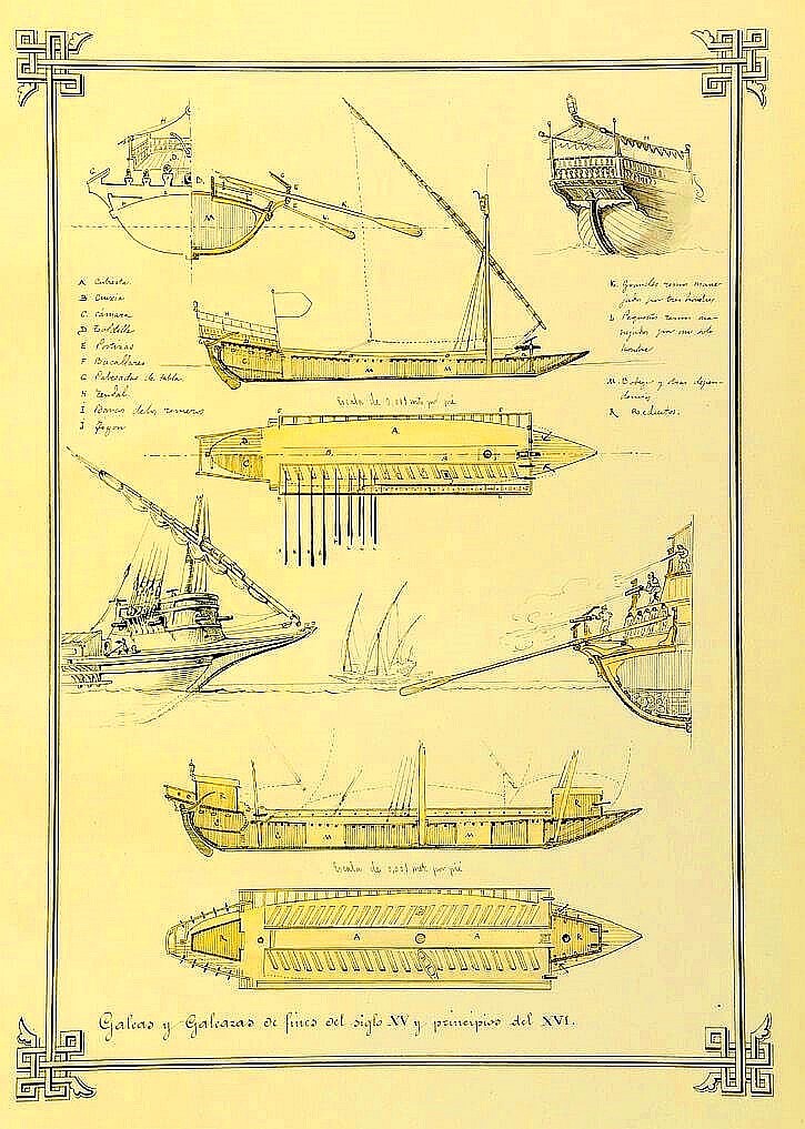 Era una nave frágil frente a la mar gruesa. La GALEOTA era más pequeña, de unos 27 metros de eslora y 3 de manga, con unos 18 remos por banda. Naves auxiliares eran las fustas, fragatas y bergantines.