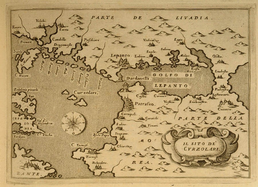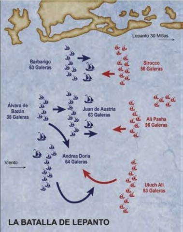 El 7 de octubre de 1571 tuvo lugar una batalla naval en el Golfo de Lepanto, entre el Peloponeso y Epiro, que enfrentó a los turcos otomanos contra una coalición cristiana, llamada Liga Santa, integrada por el Papa, la República de Venecia y la monarquía de Felipe II.