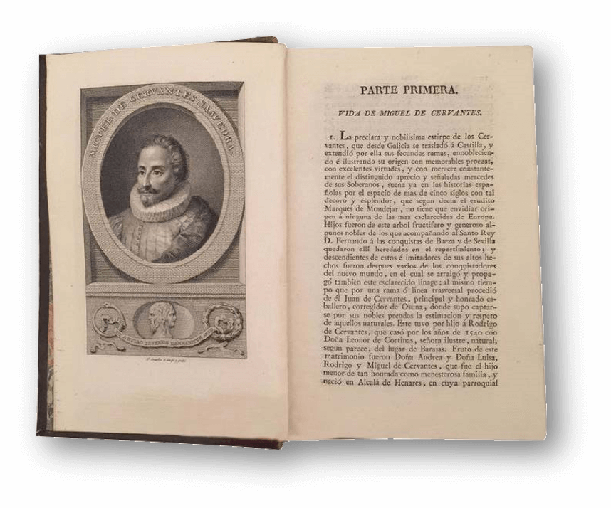 “[Este] es el rostro del autor de La Galatea y de Don Quijote de la Mancha […]. Llámase comúnmente Miguel de Cervantes Saavedra. Fue soldado muchos años, y cinco y medio cautivo, donde aprendió a tener paciencia en las adversidades. Perdió en la batalla naval de Lepanto la mano izquierda de un arcabuzazo, herida que, aunque parece fea, él la tiene por hermosa, por haberla cobrado en la más memorable y alta ocasión que vieron los pasados siglos, ni esperan ver los venideros, militando debajo de las vencedoras banderas del hijo del rayo de la guerra, Carlo Quinto, de felice memoria”.