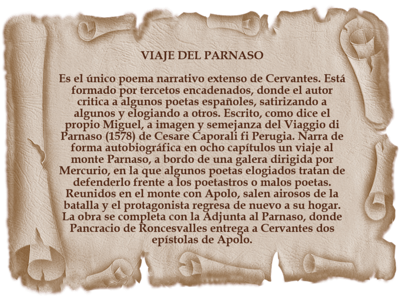 En 1614 publica la obra Viaje del Parnaso, su único poema narrativo extenso, en el que narra a través de ocho capítulos el viaje al monte Parnaso del propio autor a bordo de una galera al mando de Mercurio. En esta obra Cervantes hace una crítica a poetas de su época a través de una alegoría literaria con personajes mitológicos; también incluye referencia a sus obras anteriores y a recuerdos de su propia vida, salpicados con suave ironía y humor.