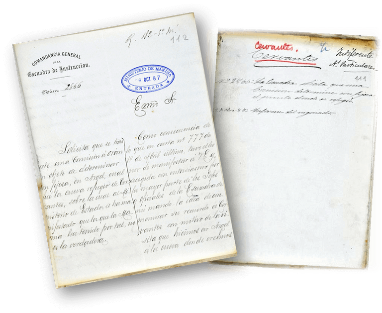 “El dicho Miguel de Cervantes estaba malo y con calentura; y […]su capitán y […]otros muchos amigos le dijeron “que pues estaba malo, no pelease, y se retirase y bajase debajo de cubierta de la dicha galera, porque no estaba para pelear”. Miguel de Cervantes respondió muy enojado: “Señores, en todas las ocasiones que hasta hoy en día se han ofrecido de guerra a S.M. y se me ha mandado y servido muy bien, como buen soldado; y ansí, ahora, no haré menos, aunque esté enfermo y con calentura; más vale pelear en servicio de Dios y de S.M. y morir por ellos que no bajarme so cubierta”, y que el capitán le pusiese en la parte y lugar que fuese mas peligrosa y que allí estaría y moriría peleando”. Documento transcrito por Pedro Torres Lanzas: Información de Miguel de Cervantes de lo que ha servido a S.M. y de lo que ha hecho estando captivo en Argel”.