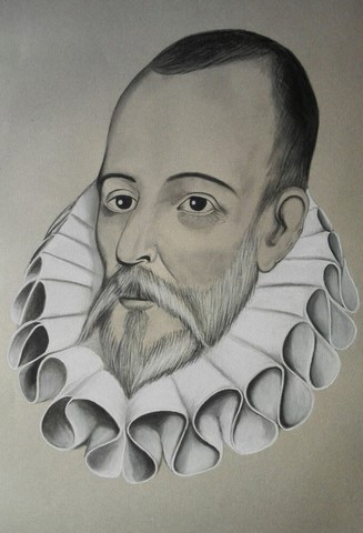 “Esta que veis aquí, de rostro aguileño, de cabello castaño, frente lisa, alegres ojos y nariz corva, aunque bien proporcionada; las barbas de plata, que no ha veinte años fueron de oro; los bigotes grandes, la boca pequeña; el cuerpo entre dos extremos, ni grande ni pequeño; la color viva, antes blanca que morena; algo cargado de espaldas y no muy ligero de pies; éste, digo, que es el rostro del autor de La Galatea y de Don Quijote de la Mancha…”.