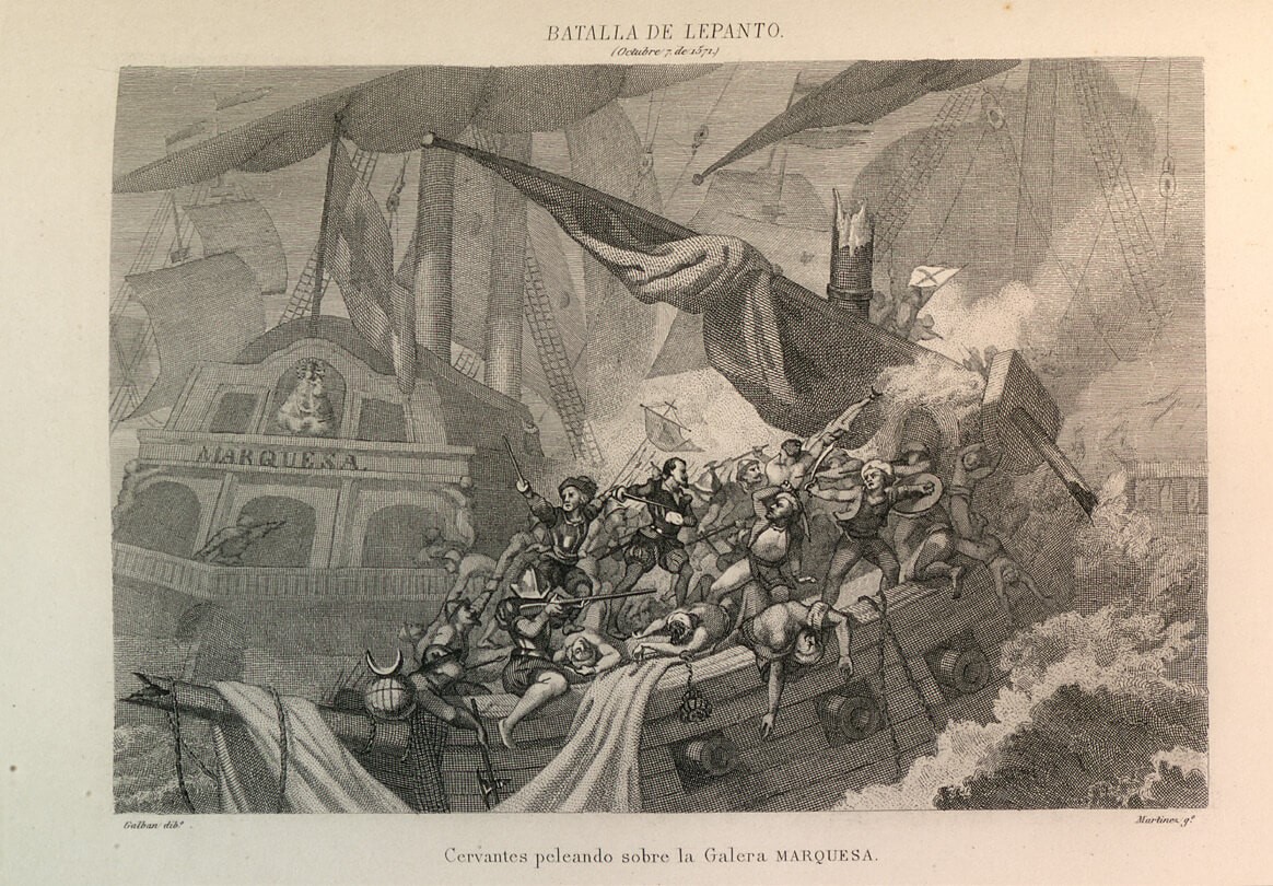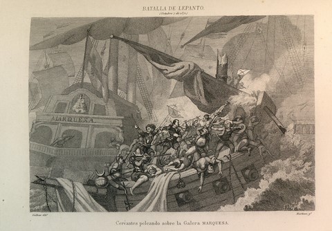 Cervantes abrazó el camino de las armas y con 24 años recién cumplidos fue testigo y protagonista directo de uno de los más cruentos espectáculos de la historia: la batalla de Lepanto, donde demostró su valentía personal pues enfermo de malaria luchó en primera línea.