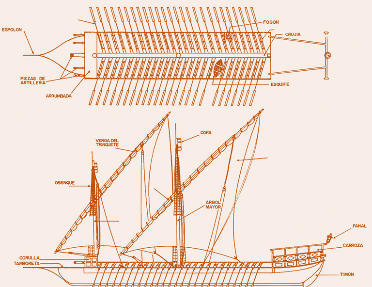 Más tarde las galeras ordinarias tendrían 26 bancos y no era raro que cada uno llevara cuatro remeros asiendo un solo remo, de bastante mayor talla, denominado de “galocha”.