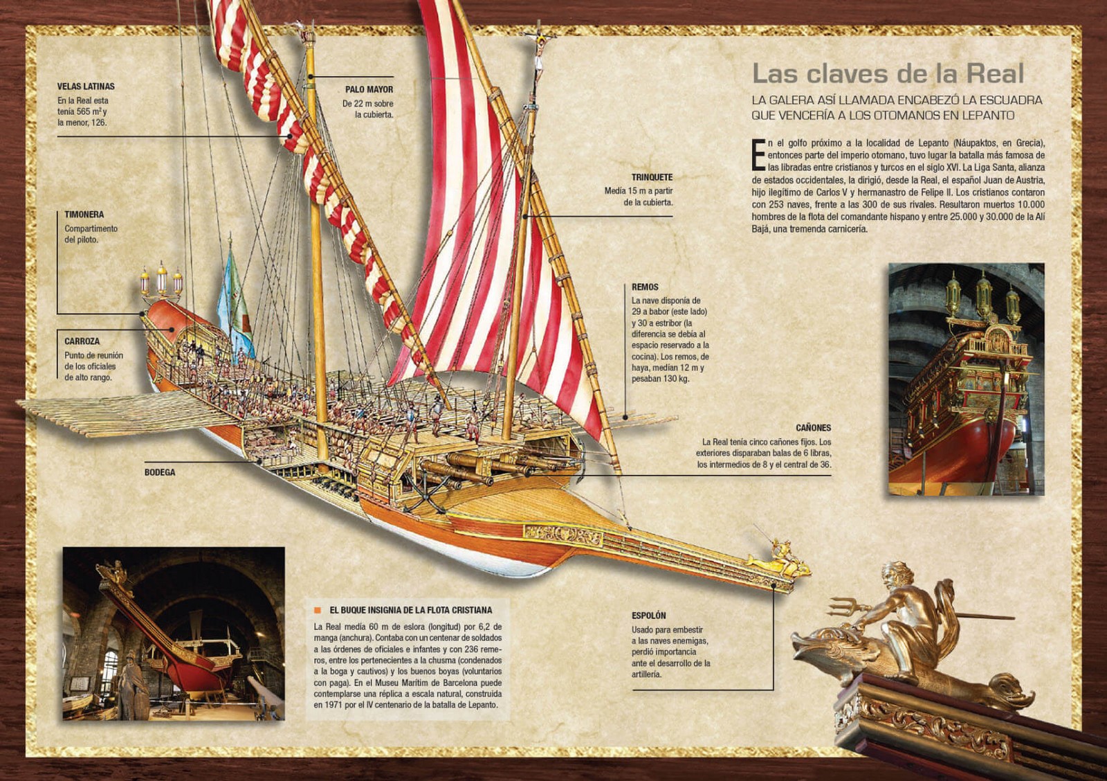 El dibujo de la izquierda recrea una galera española típica de la segunda mitad del siglo XVI, con 24 bancos de boga por banda, del tipo de las que combatieron en Lepanto.