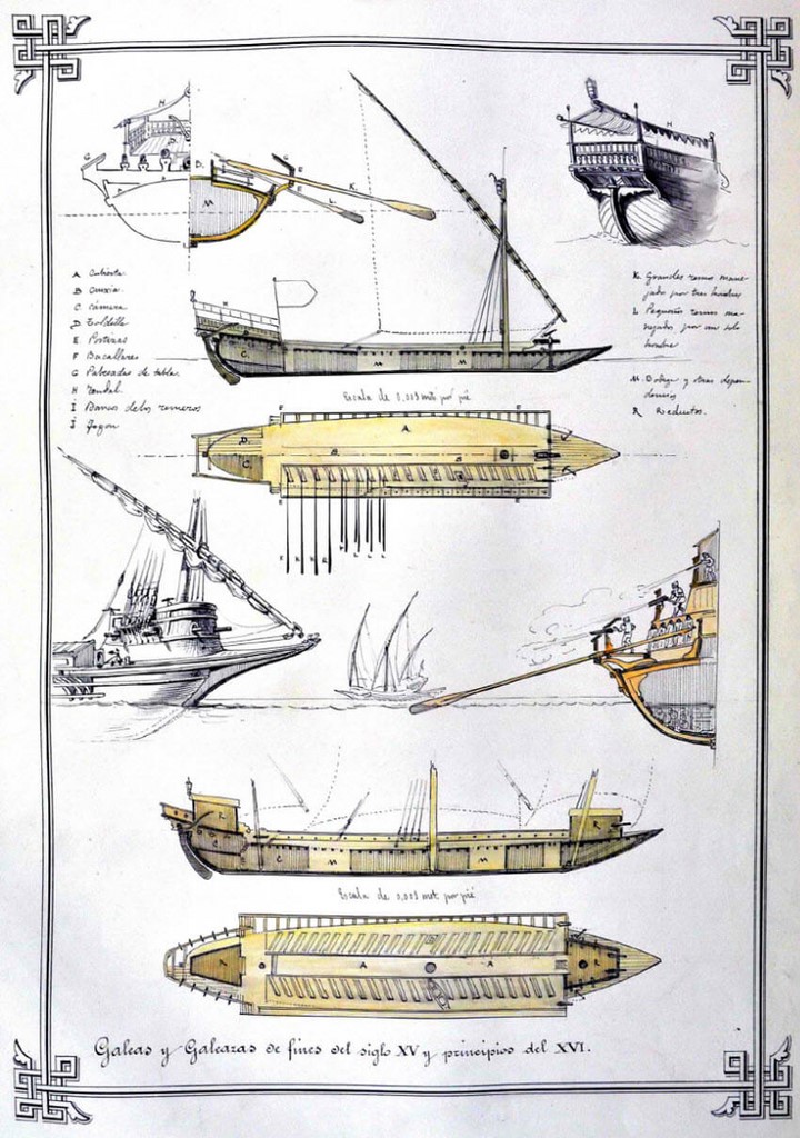 La galera está presente en la Historia Marítima Española desde la época de ......................... que la define en ........................................... como buque exclusivamente militar y presenta perfiles de la misma en el Códice de sus famosas ................................. que actualmente han sido digitalizadas y publicadas en la web de Patrimonio Nacional.