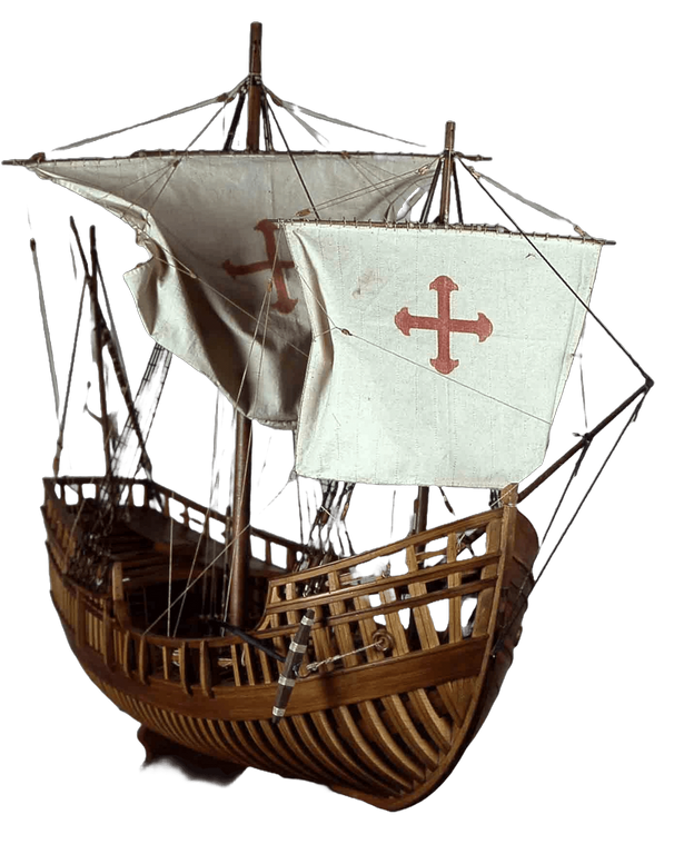 [2] La carabela tiene su origen en la galera mediterránea y el cárabo moro. Con buenas cualidades marineras y capacidad de navegar ganando barlovento. De poca manga y bastante eslora, aparejada con velas latinas y con un porte de 30 y 70 toneladas aproximadamente.