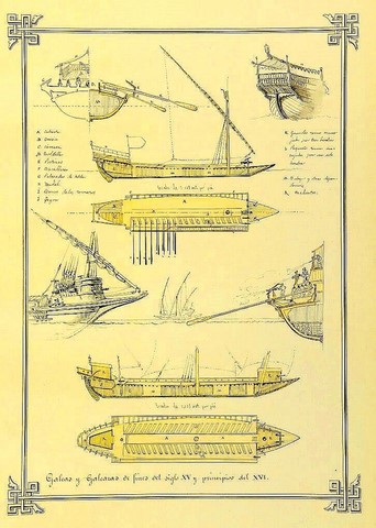 Era una nave frágil frente a la mar gruesa. La GALEOTA era más pequeña, de unos 27 metros de eslora y 3 de manga, con unos 18 remos por banda. Naves auxiliares eran las fustas, fragatas y bergantines.