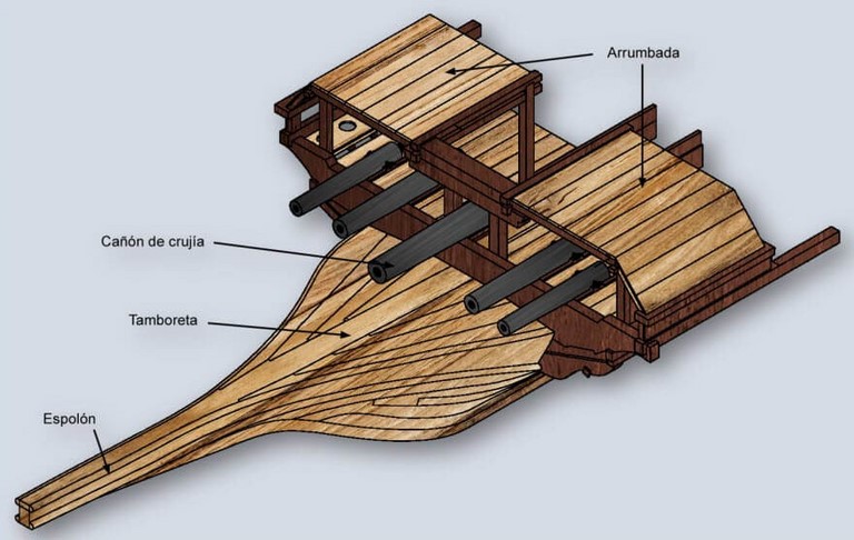 Entre las estructuras de proa vemos, en primer lugar, el espolón que cumplía una doble función: servir como arma de abordaje y de punto donde afianzar el aparejo. A veces constituía un obstáculo para el fuego artillero, por lo que se cortaba cuando se combatía con la nave sin arbolar, “a palo seco”, sólo con la fuerza humana de la boga.