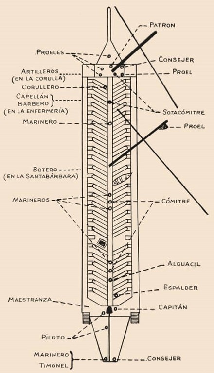 Por su parte, la gente de mar la componían el capellán, el protomédico o el cirujano, el patrón, el cómitre y sotacómitres, el piloto y sus consejeros, el calafate, el botero, el remolar, los artilleros, los alguaciles y sotaalguaciles, los timoneles, los marineros de flecha y marineros y los proeles.