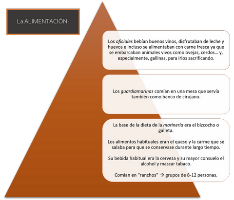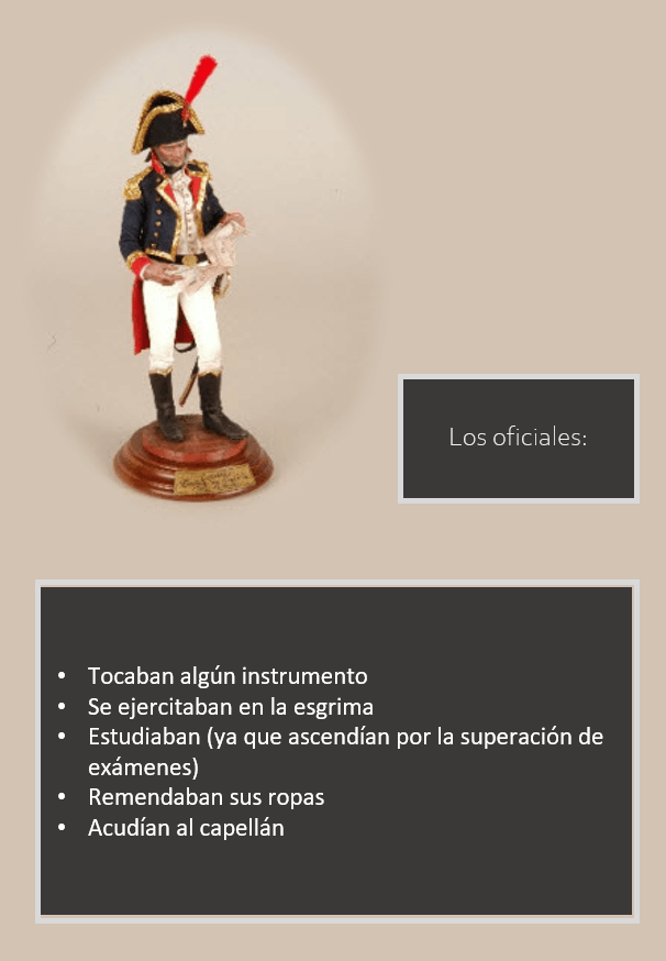 Los Oficiales llevaban sus propios sirvientes y gozaban de intimidad en camarotes con luz natural y buenos muebles. Algunos, incluso, disfrutaban de bañera y tenían un catre colgante así como un retrete propio.