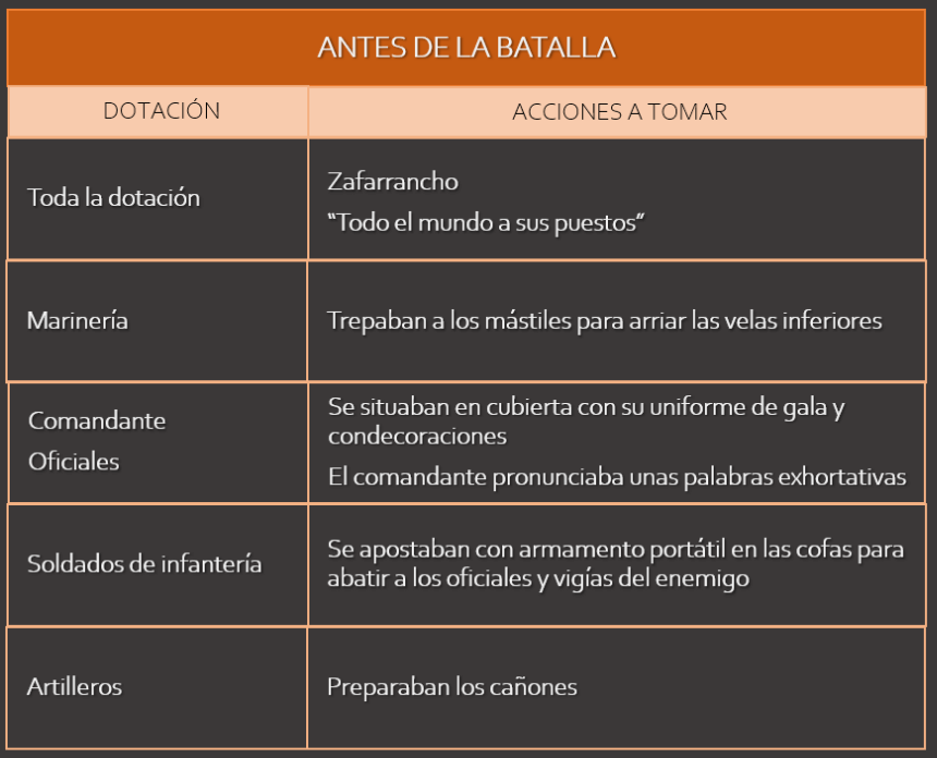 Desde finales del siglo XVII el modo habitual de combatir en el mar obedecía a una táctica estricta que consistía en: formar una línea de fila y situarse de perfil en paralelo al enemigo, pues los barcos tenían los cañones a los lados.