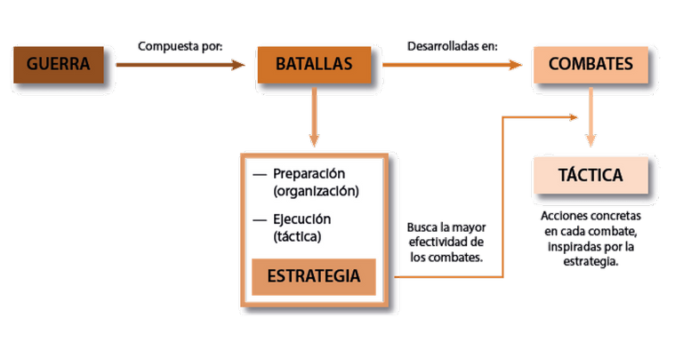 De la estrategia se derivan los combates, se esfuerza porque tengan lugar en las mejores condiciones y porque produzcan los mejores resultados; los enlaza entre sí, los domina y los coordina para mantenerlos sobre la línea directriz que ella ha fijado, y que acomoda a los acontecimientos.