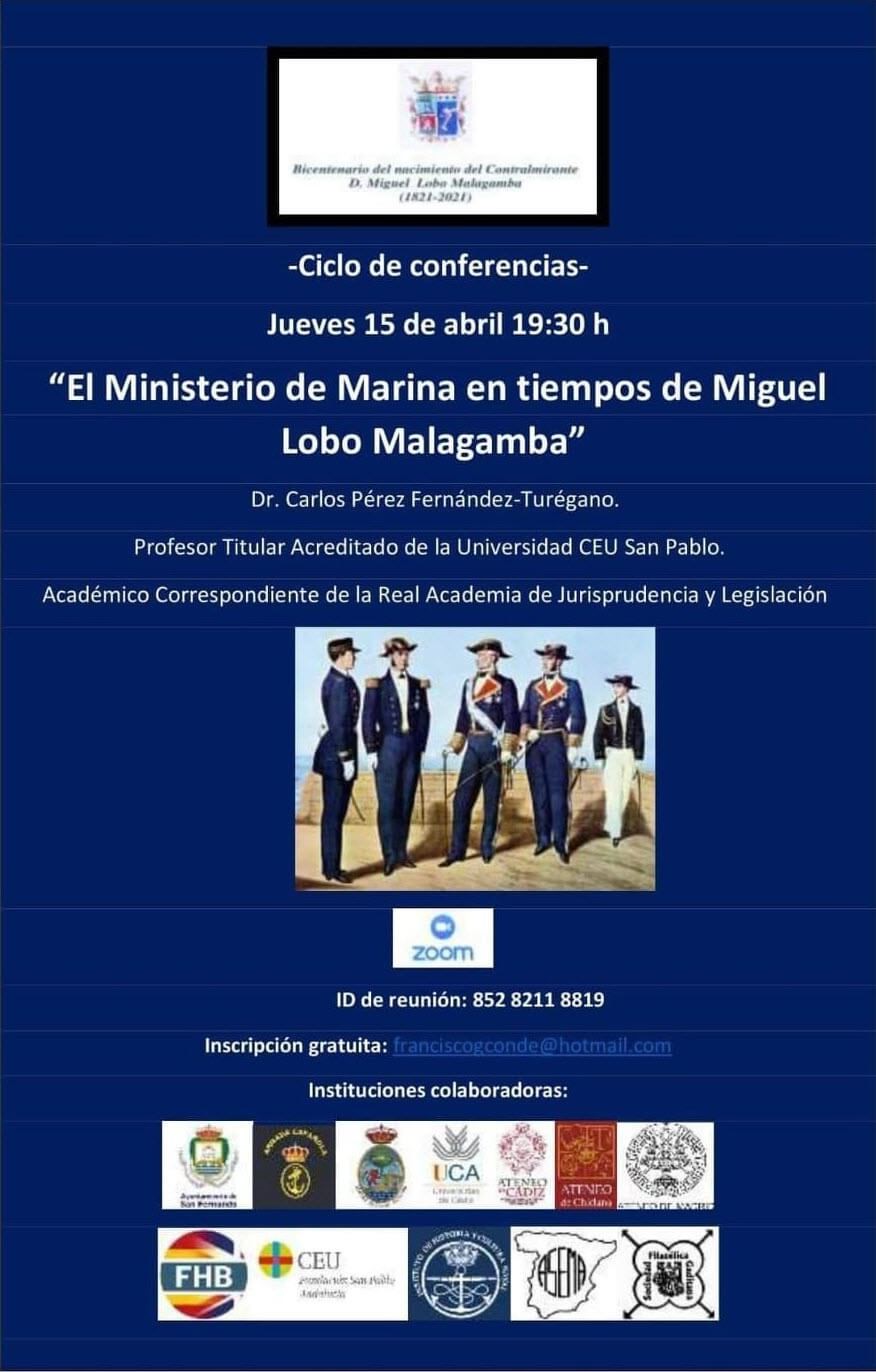 Este próximo Jueves 15 de abril a las 19:30h, tendrá lugar la conferencia titulada “El Ministerio de Marina en tiempos de Miguel Lobo Malagamba” a cargo del Dr. Carlos Pérez Fernández-Turégano, Profesor Titular Acreditado de la Universidad CEU San Pablo y Académico Correspondiente de la Real Academia de Jurisprudencia y Legislación.