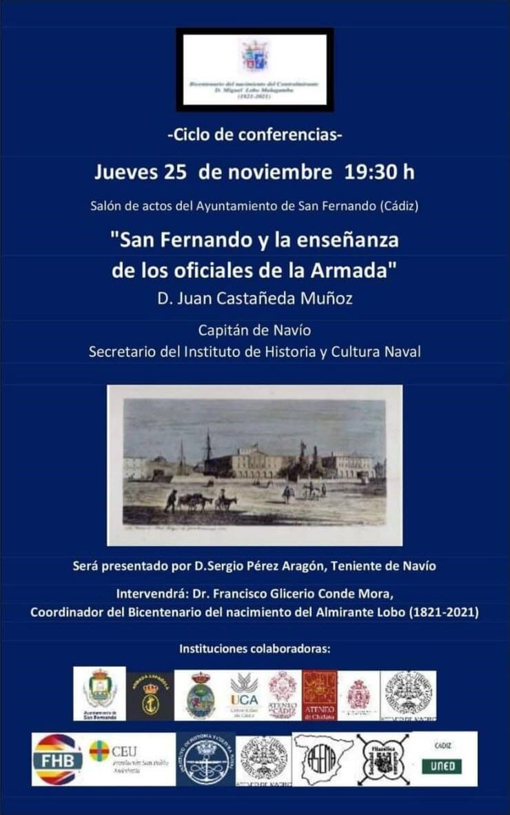 Impartida por D. Marcelino González, Capitán de Navio (r) y vicepresidente de la Real Liga Naval Española, estará disponible a través del canal de YouTube de la Real Academia de la Mar, o a través de su página web, a partir del martes 27 de abril.Bicentenario del nacimiento del Contralmirante D. Miguel Lobo Malagamba (1821-2021)